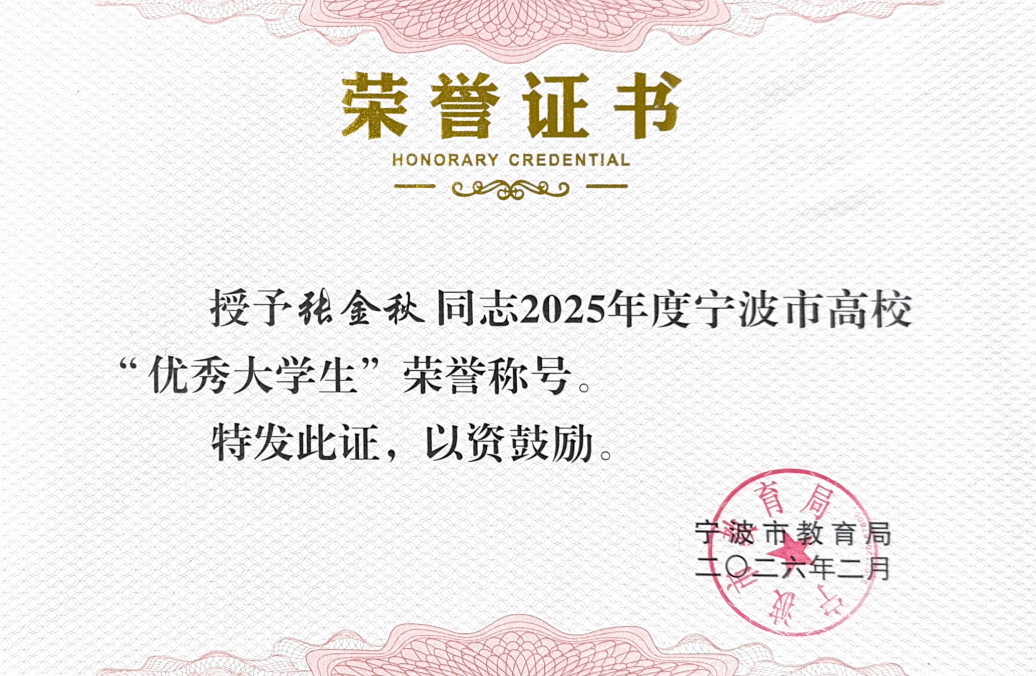 此前,张金秋同学已荣获2025年度宁波市高校“优秀大学生” 荣誉称号,近期他连续斩获市级、校级两项高级别荣誉,充分彰显了物院学子的卓越综合实力与榜样风采。
