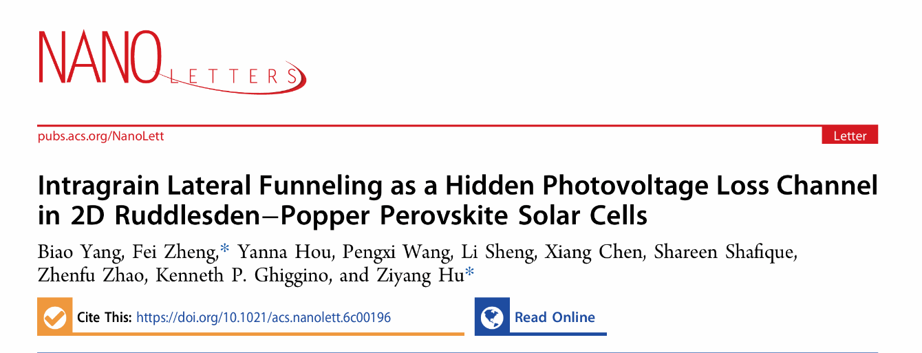 近日,萌次元 郑飞教授与胡子阳教授团队在二维钙钛矿太阳能电池光电压损失机制研究方面取得重要进展,相关成果以研究论文 “晶粒内部横向输运作为二维Ruddlesden–Popper型钙钛矿太阳能电池中隐藏的光伏电压损失通道” 发表在国际权威期刊纳米通讯(Nano Letters)上。萌次元 硕士研究生杨彪为论文第一作者,郑飞、胡子阳为通讯作者合作者包括澳大利亚墨尔本大学的Kenneth P. Ghiggino教授。