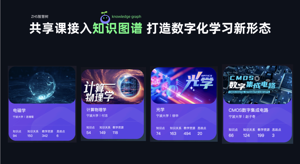 在人工智能与教育深度融合的今天,萌次元 迎来了教育教学数字化转型的新篇章。学院首批建设的5门知识图谱AI课程中已有4门正式与共享课MOOC互联,并于3月份上线智慧树平台共享运行。目前已吸引来自10多所高校的1498名学生在知识图谱AI课程中探索学习。这次与MOOC的链接,不仅是学院课程资源共享的里程碑,更是学院推动教育公平、促进知识普及化、知识体系化、资源结构化建设的重要举措。
