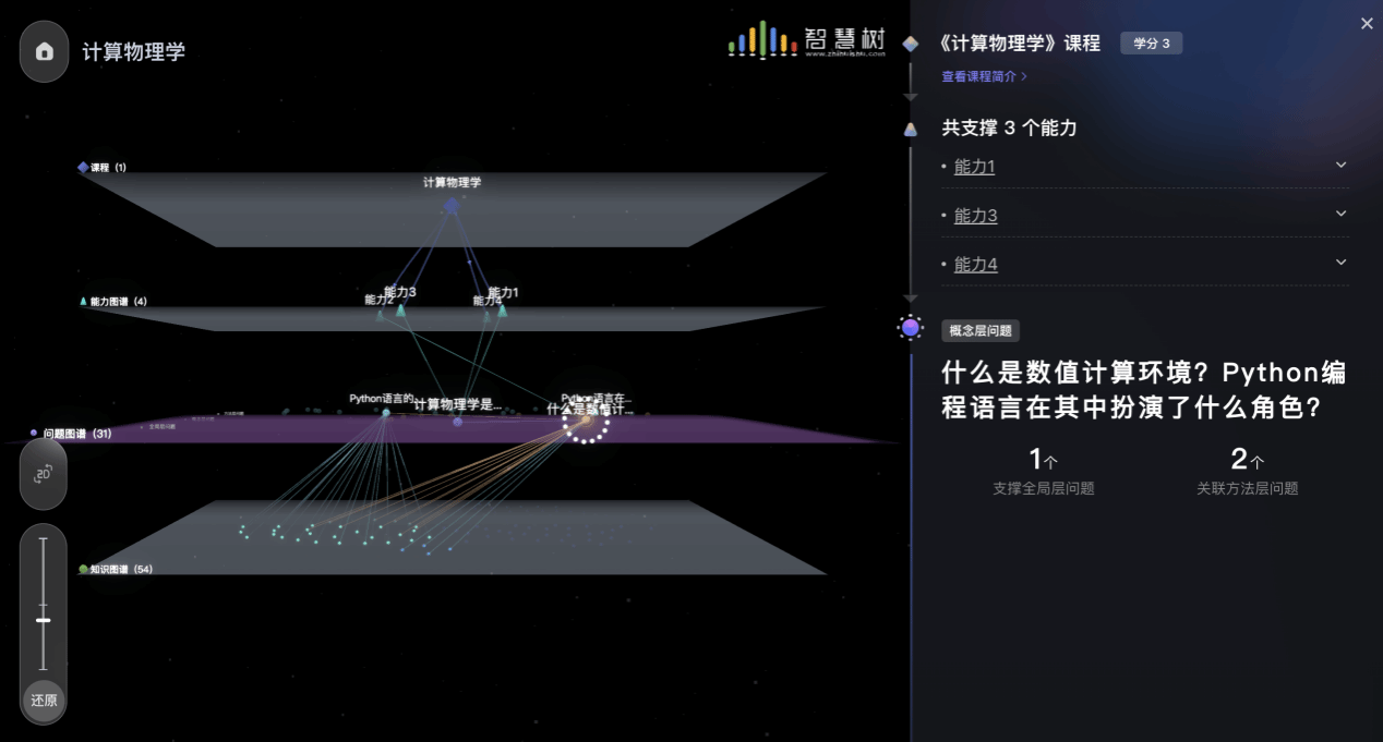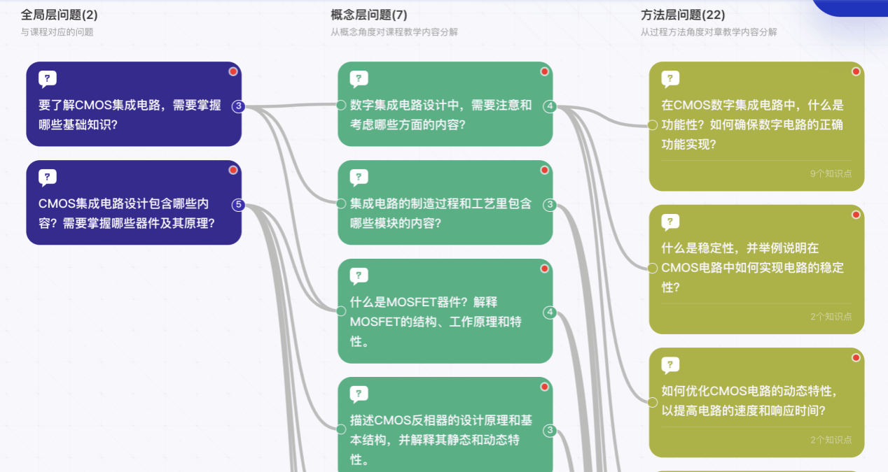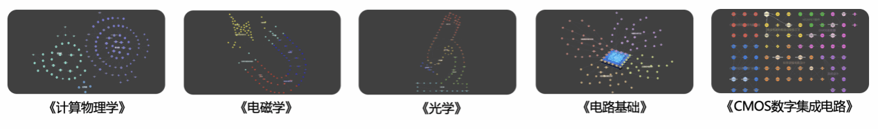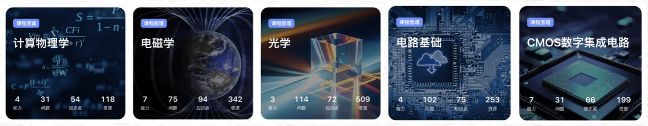 在知识图谱AI课程筹划和建设的过程中,各课程团队成员和智慧树团队一起研讨教学创新亮点,他们运用丰富的案例、互动讨论和在线实验等方式,让学习过程既富有挑战性又充满乐趣。团队聚焦课程目标、知识框架、学习逻辑等关键问题,拆解、细化专业知识。结合教学实施情况,“电磁学” 知识图谱AI课程系统搭建了7项能力目标,梳理了75个问题,94个知识点,构建了150个知识关系,拓展了342个教学资源;“计算物理学” 知识图谱AI课程系统搭建了4项能力目标,梳理了31个问题,54个知识点,构建了149个知识关系,拓展了118个教学资源;“光学” 知识图谱AI课程系统搭建了3项能力目标,梳理了114个问题,72个知识点,构建了156个知识关系,拓展了509个教学资源;“电路基础”知识图谱AI课程系统搭建了4项能力、梳理了102个问题,75个知识点,构建了131个知识关系,拓展了253个教学资源;“CMOS数字集成电路”知识图谱AI课程系统搭建了7项能力目标、梳理了31个问题,66个知识点,构建了127个知识关系,拓展了199个教学资源。每门知识图谱AI课程均包含教学资源层、知识体系层、问题体系层、能力体系层等4个维度,将每门课程的知识点有机地联系在一起,形成了一个完整的、多维度的知识网络,帮助学生全面掌握课程知识体系,加强对萌次元