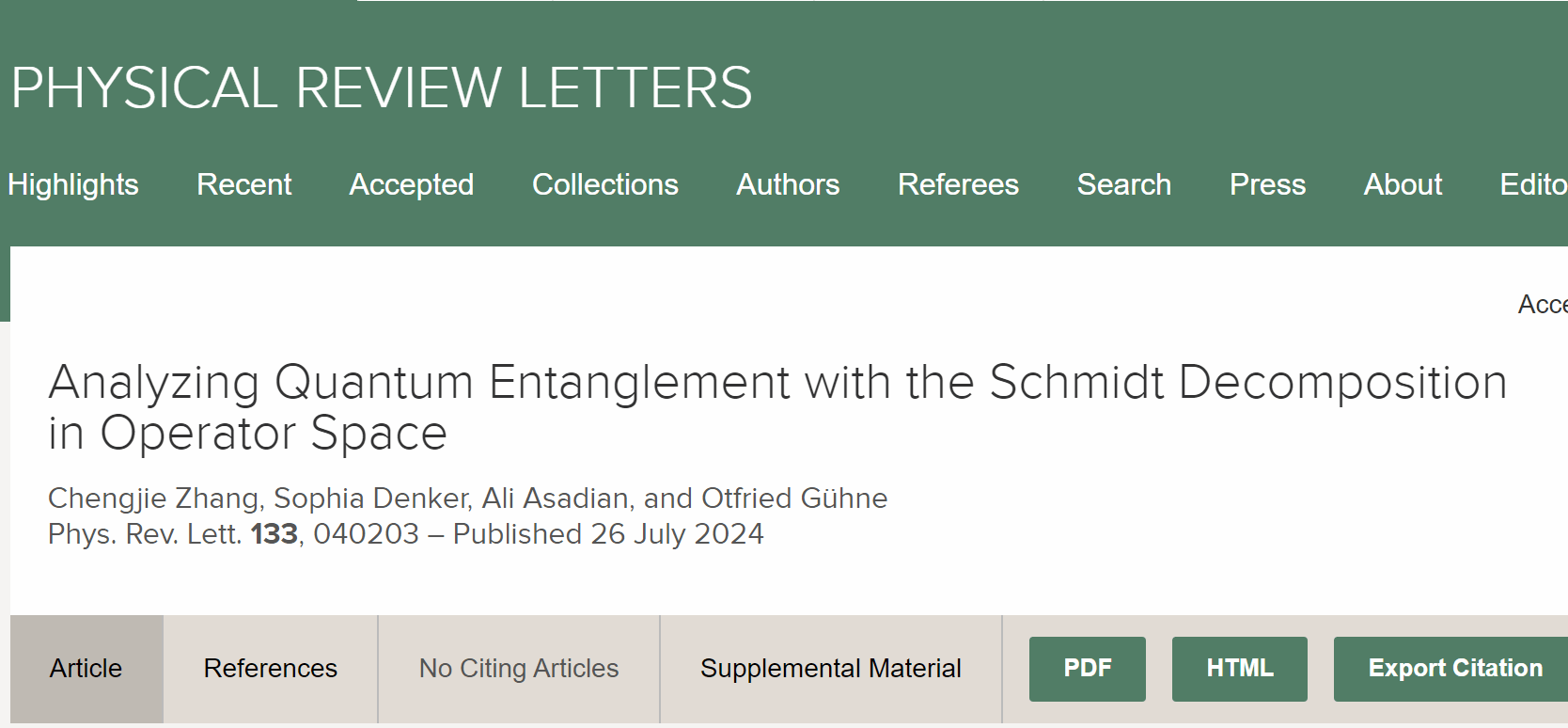 近日,萌次元 张成杰教授课题组与德国锡根大学Otfried Gühne教授率领的研究团队携手,在量子纠缠这一前沿领域取得了突破性进展。他们创新性地提出了基于算符空间施密特分解的真多体量子纠缠目击者方法,这一成果不仅超越了传统基于保真度的检测方法,更通过详尽的量子态分析实证了其显著提升量子纠缠检测效能的能力。此项开创性研究,以“Analyzing Quantum Entanglement with the Schmidt Decomposition in Operator Space”(用算符空间中施密特分解分析量子纠缠)为题,荣耀刊登于国际顶尖学术期刊《Physical Review Letters》上,于2024年7月26日正式发布,标志着量子纠缠研究迈向了新的里程碑。