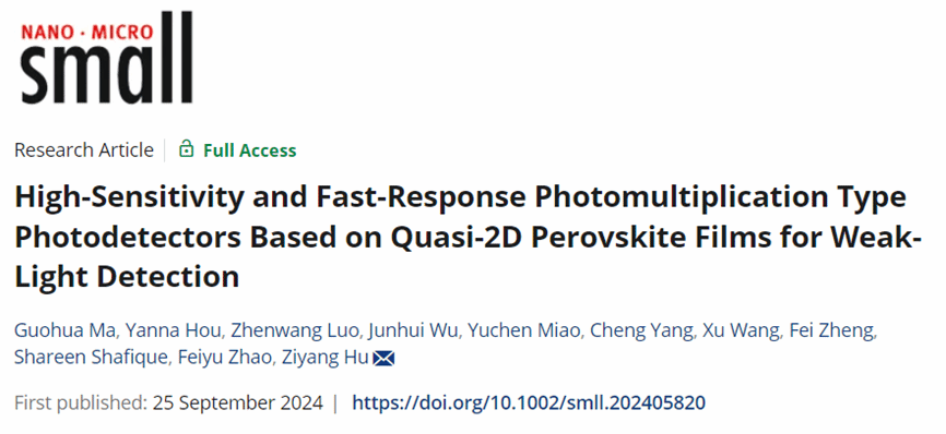 胡子阳教授领衔的课题组在准二维钙钛矿光电探测器领域取得了显著的科研成果。该团队的研究论文 “High-Sensitivity and Fast-Response Photomultiplication Type Photodetectors Based on Quasi-2D Perovskite Films for Weak-Light Detection” 在国际知名学术期刊《Small》上发表。论文的第一作者是萌次元