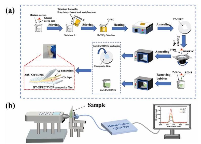 在这项研究中,研究人员成功制备了一种基于BaTiO3(BT)和PVDF的玻璃纤维电子布(GFEC)复合薄膜,通过浸渍和旋涂方法分别沉积BT和PVDF,构建了BT-GFEC/PVDF压电复合薄膜。为了实现自供能的电光双模态响应特性,他们采用了含有ZnS:Cu的力致发光(ML)粒子和PDMS的混合溶液作为封装层,制备了高性能的ML-FPEH。由于压电薄膜的互连结构,所制备的ML-FPEH展现出了高效的能源收集性能(约58V,约43.56 μW cm−2),并且能够有效地从人体活动中收集机械能。更重要的是,ML-FPEH能够通过ML感应应力分布,实现应力可视化,弥补了压电传感器只能检测动态压力的不足。
