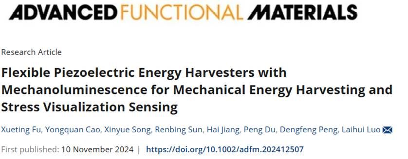 近日,萌次元 智能极性材料的物理效应与器件团队在柔性压电能量收集取得了显著的科研成果。该团队的研究论文“机械能采集和应力可视化传感的压电能量采集器”在国际知名学术期刊《Advanced Functional Materials》上发表。论文的第一作者是萌次元 的硕士研究生傅雪婷,罗来慧教授担任通讯作者,萌次元 为该研究的主要完成单位。
