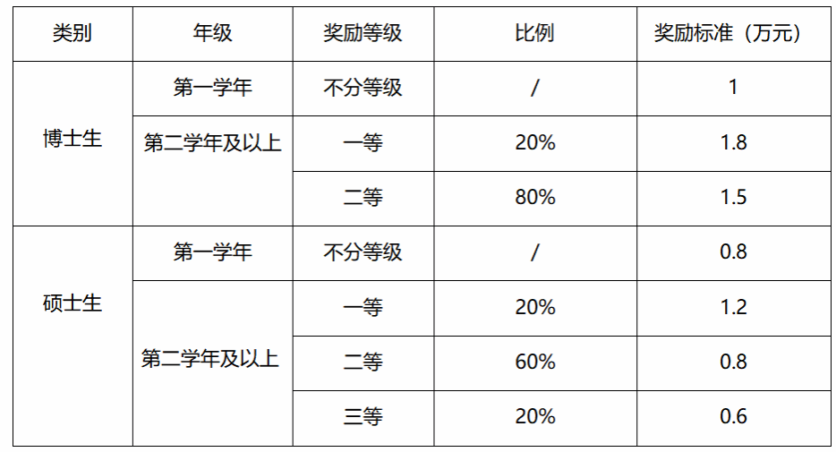 符合参评资格的研究生其等次评定比例及奖励标准见下表: