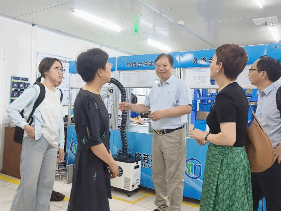 在祢若科技董事长胡克银先生、总经理胡珊珊女士及公司研发团队骨干成员的陪同下,学院一行首先参观了该公司变色材料生产组装流水线、产品质检线等主要生产区域,深入了解该企业的生产模式、工作环境及用人需求。