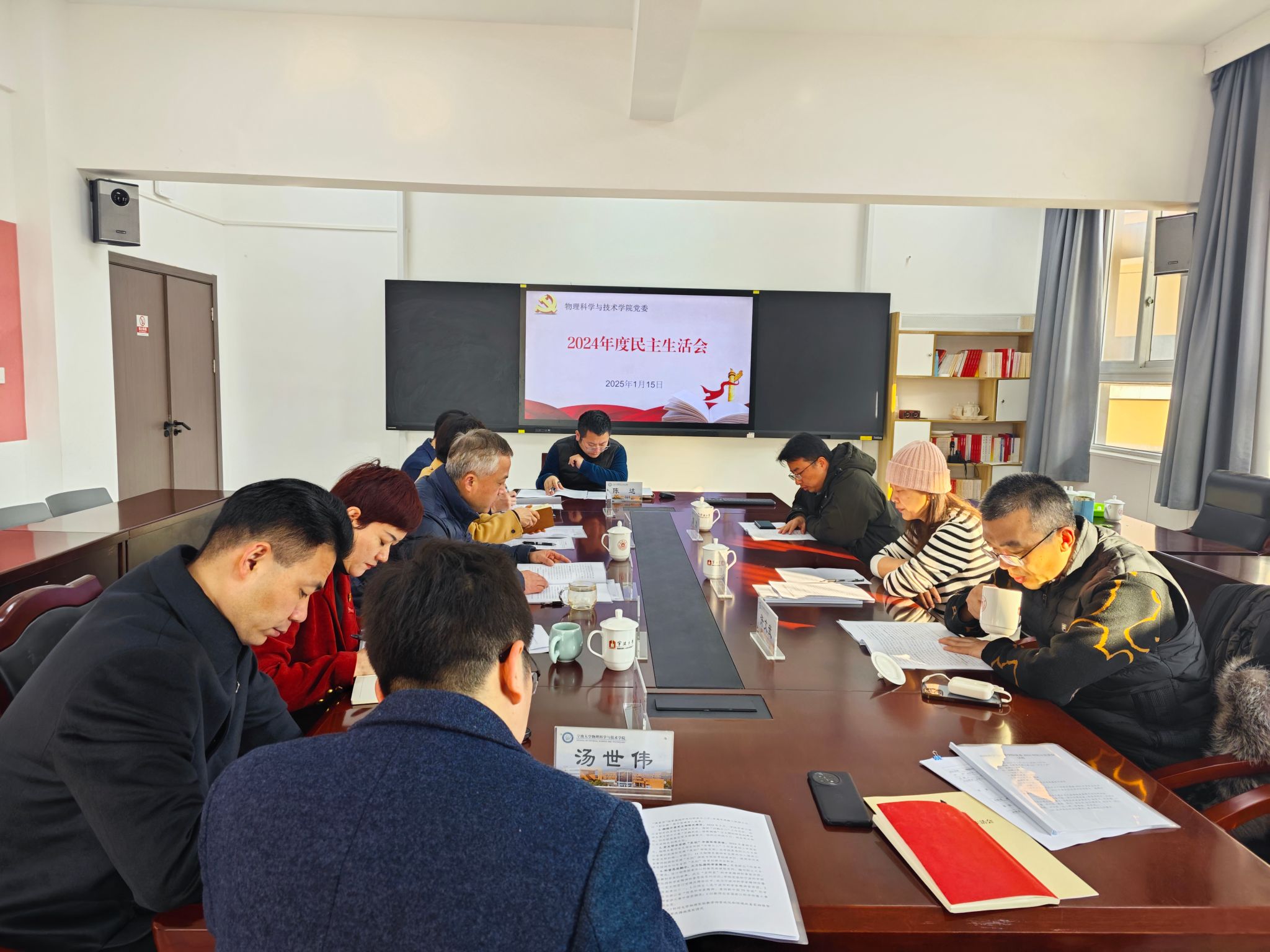 1月15日,萌次元 党委在龙赛理科楼北楼228“党员之家”召开学院2024年度民主生活会,学院全体党委班子成员参加,校级组织员方晓春、党外人士代表胡军、教师代表许文武列席,会议由学院党委书记朱学庆主持。