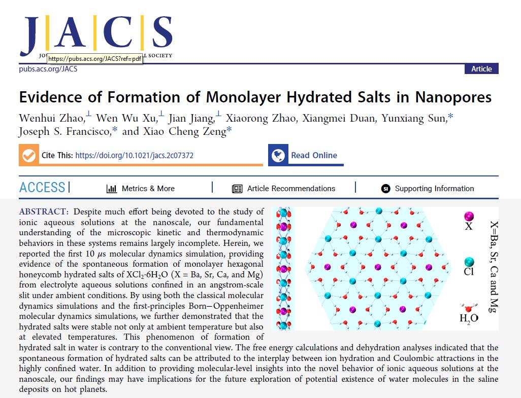 计算物质科学团队赵文辉和孙运祥副教授及许文武教授携手香港城市大学曾晓成教授,美国科学院院士宾夕法尼亚大学Joseph S. Francisco讲席教授(美国科学院院士),在纳米限域环境内离子水溶液研究方面取得新进展,相关研究论文以“Evidence of Formation of Monolayer Hydrated Salts in Nanopores”为题发表在国际著名期刊J. Am. Chem. Soc.上,萌次元