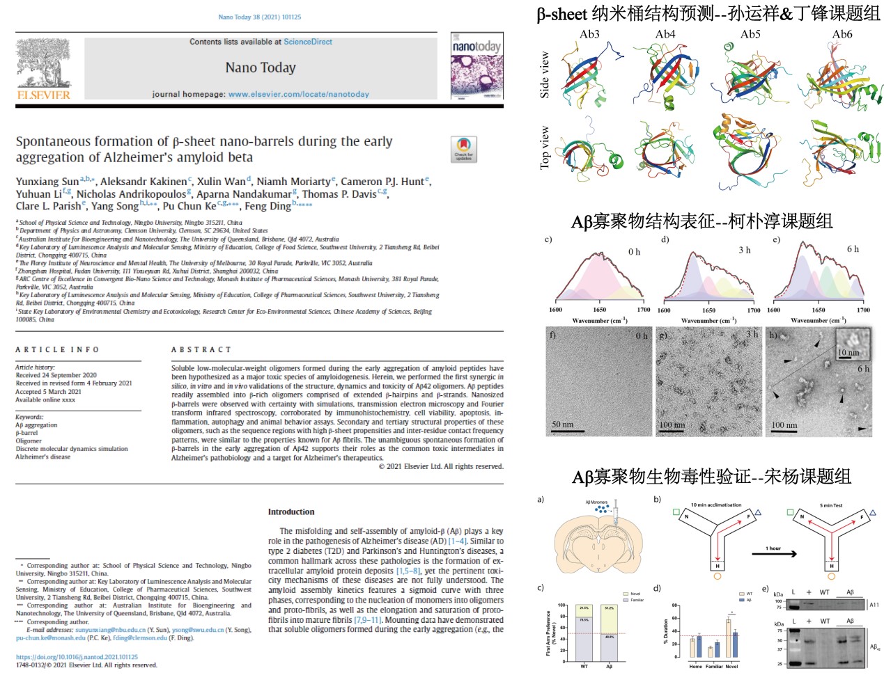 孙运祥(第一作者、通讯作者)副教授、美国Clemson大学丁锋教授(通讯作者)、澳大利亚Queensland大学柯朴淳教授(通讯作者)、中国科学院生态环境研究中心宋扬研究员(通讯作者)课题组联合在《Nano Today》(影响因子16.907)杂志发表题为“Spontaneous formation of β-sheet nano-barrels during the early aggregation...