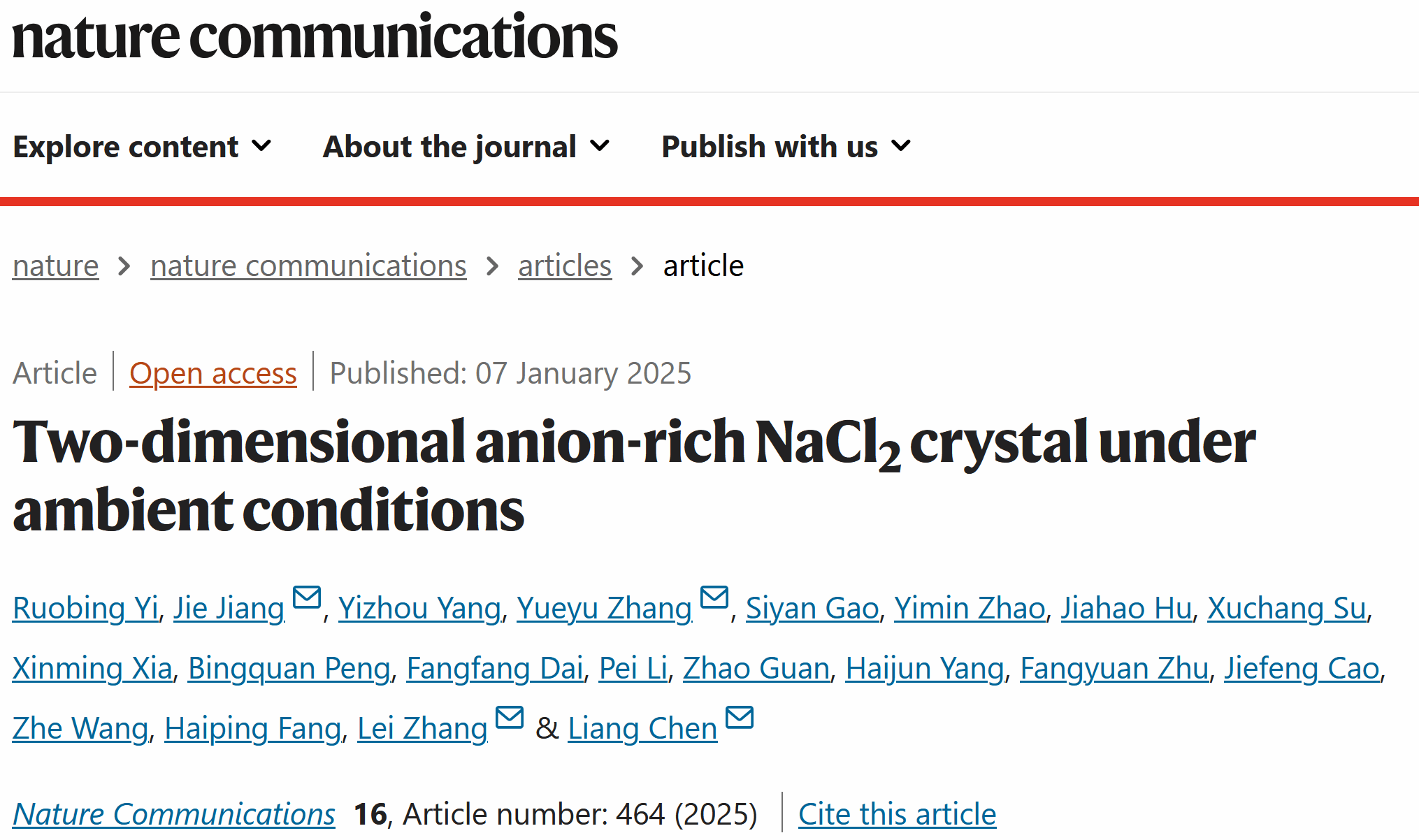 微纳系统表面物理团队联合西安交通大学、国科温州研究院、华东理工大学、华东师范大学等,在《Nature Communications》杂志上发表了题为《Two-dimensional anion-rich NaCl2 crystal under ambient conditions》的研究论文。该论文报道了一种在常温常压下稳定的二维NaCl2晶体及其独特的室温铁磁性质。这一发现是团队继Na2Cl晶体研究系列工作之后(《Nat. Chem.》2018;《Adv. Mater.》2023),实现了Na-Cl盐晶体的元素计量比从2:...